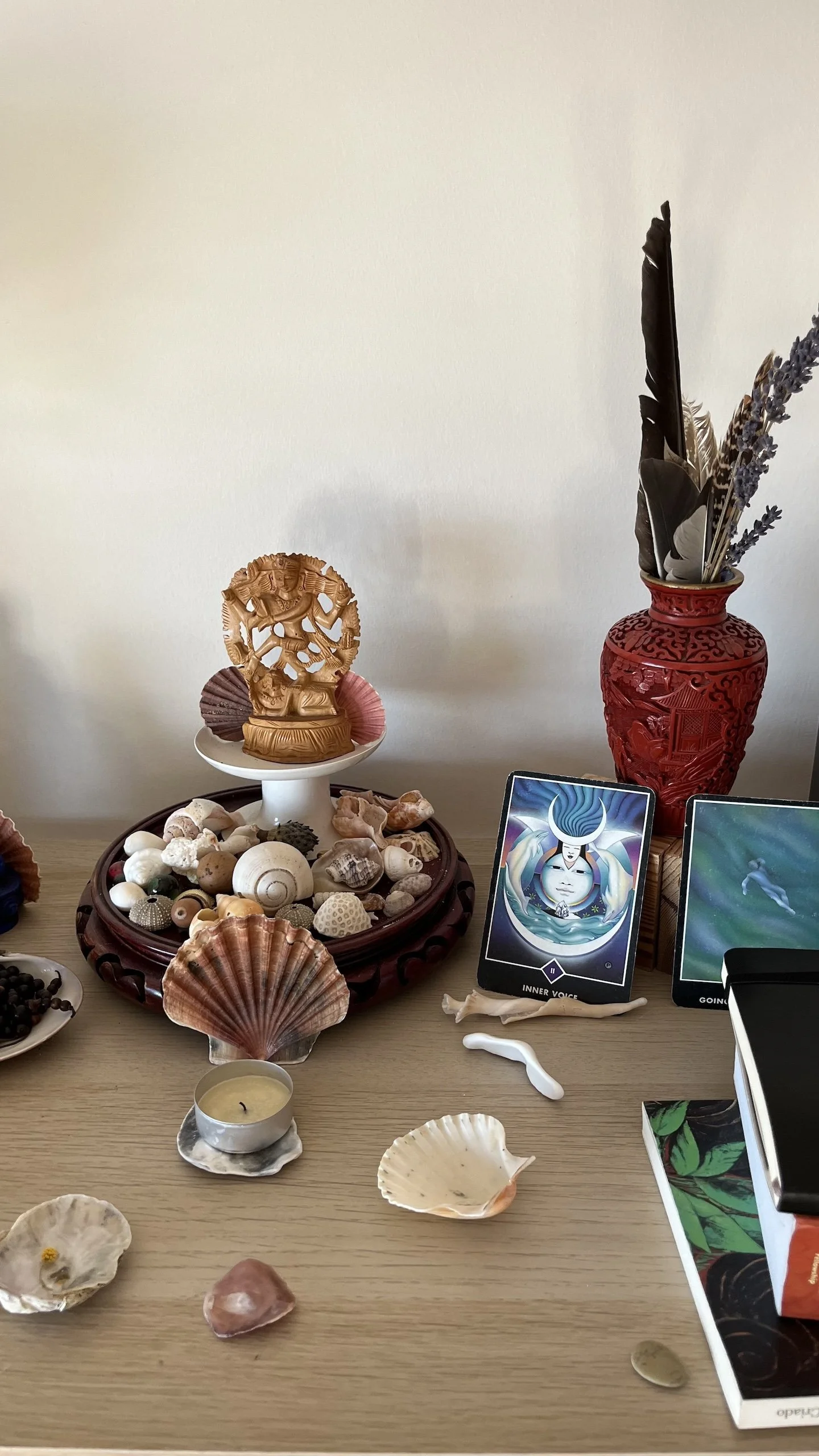 My home reflects this. There is a simple altar with figures of Buddha and Shiva, a tarot deck gifted by a wise woman I still write to, shells from every beach I have visited since my thirties, and a painted glass bottle someone once gave me to hold sighs. It now also holds pieces of sea glass I collect on walks. Not a collection, more like an ongoing conversation with things that have meaning.